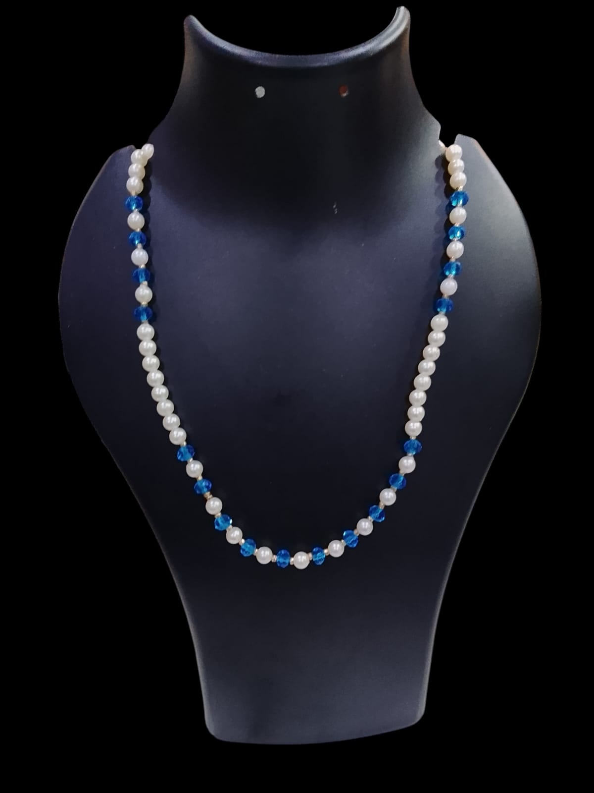 Handcrafted moti and blue crystal mala, lightweight and suitable for all occasions.