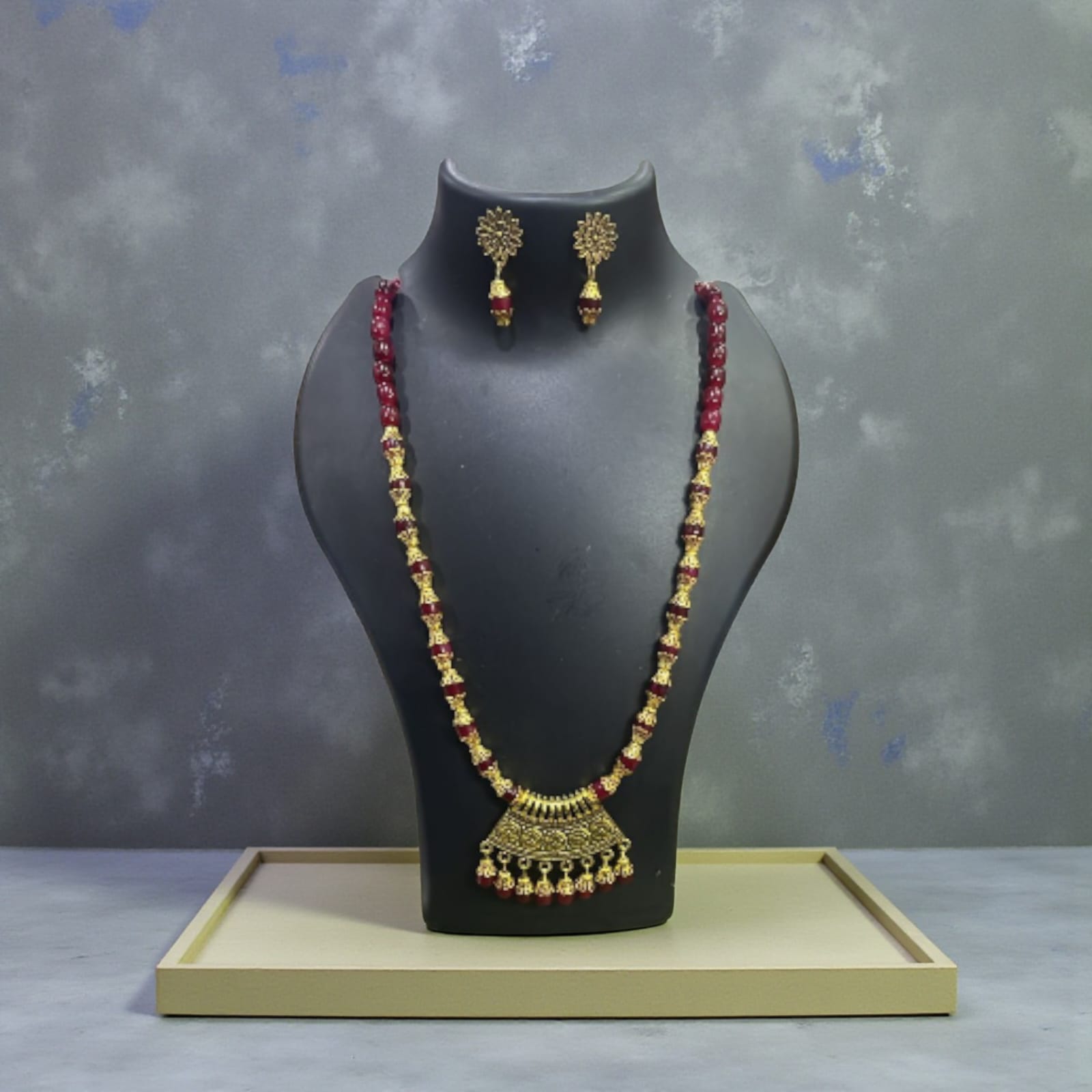 with ruby-red beads and anTraditional long necklace craftedtique gold elements, finished with a beautifully detailed pendant. Paired with matching earrings for a complete ethnic look.”