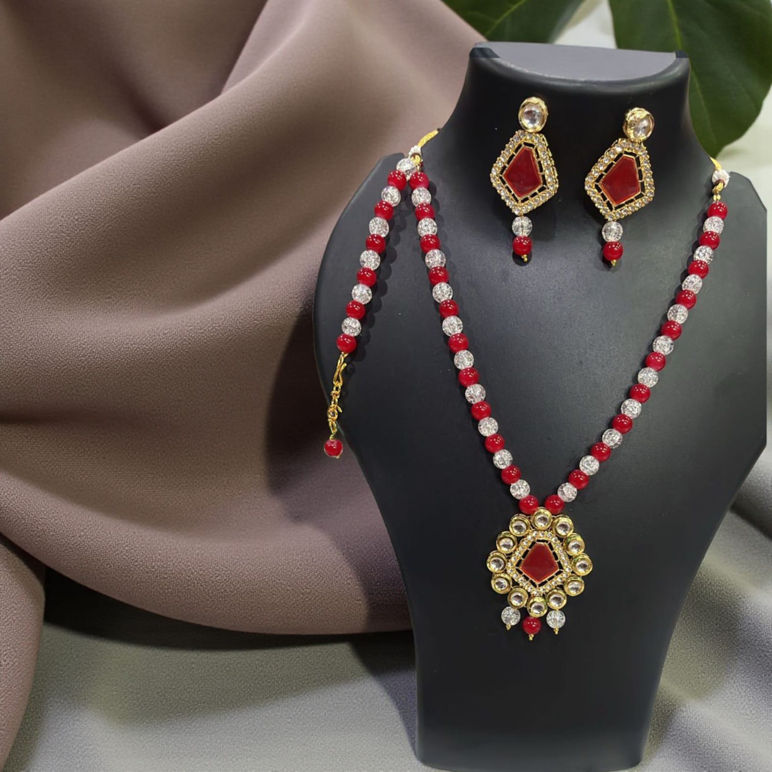 Elegant red & white beaded necklace with a gold- toned pandent a matching satement earring. the rech red stones add a classic festive touch, , making it perfect for weddings & traditional occasions.